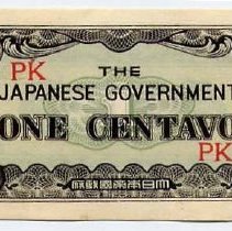 Green and black printed 'centavo.' Number '1' in all four corners. Printed lettering at center: "THE // JAPANESE GOVERNMENT // ONE CENTAVO."