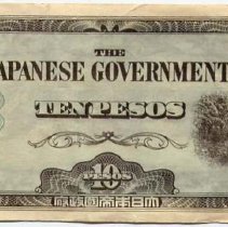 Green and black printed 'ten pesos.' Number '10' in top two corners on front. Printed lettering at center: "THE // JAPANESE GOVERNMENT // TENPESOS." Reverse printed in brown and white.