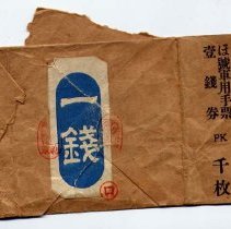 Brown envelope (possibly carried currency - 2003.52.4-.5). Blue and white label on front with Japanese characters printed on it. Small black printed characters at side. Two large black characters on back. Ripped and folded in various places.